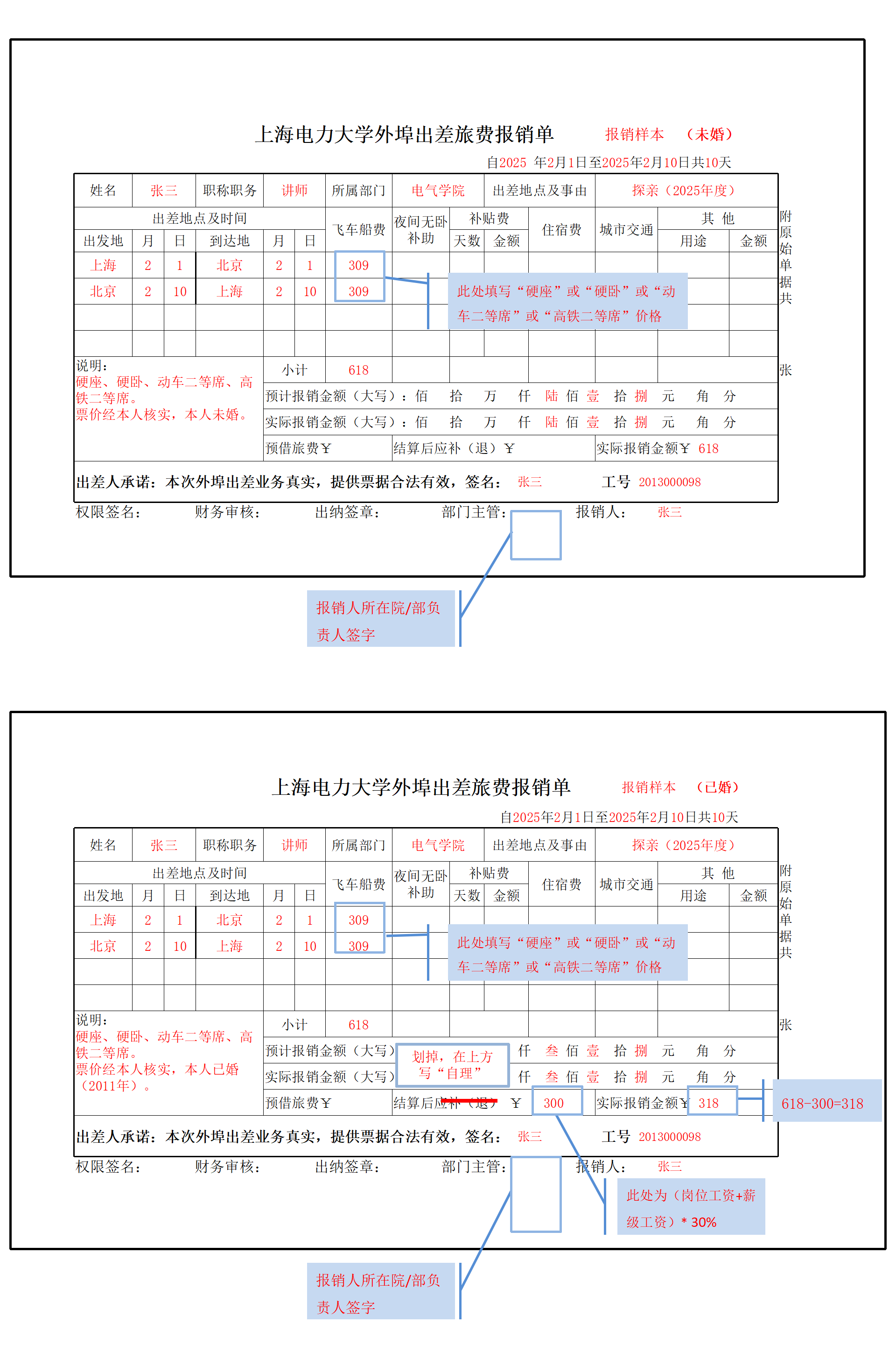 上电人〔2020〕13 号 关于我校教职工外地探亲政策和待遇的规定.doc的文件精神,现定于10月27日--11月7日期间的工作日进行2025年下半年探亲路费报销登记,请符合报销条件的教职工凭2024-2025年期间的车船票、机票(行程单和登机牌)等票据,自行填写《上海电力大学外埠出差旅费报销单》(填写样本: