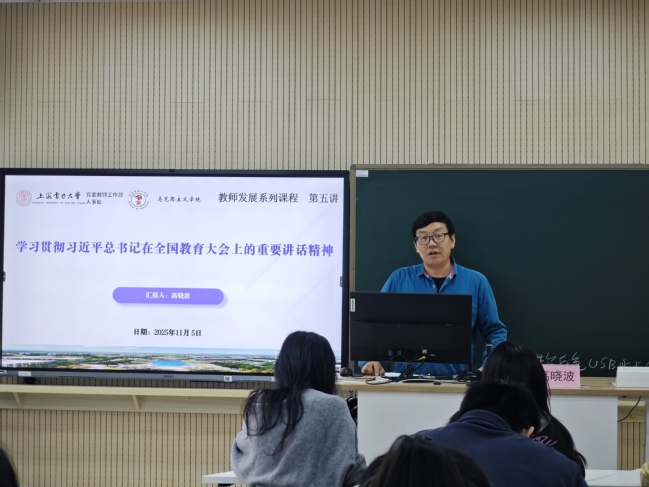 为深入学习党的二十届四中全会精神,贯彻落实全国教育大会精神、上海市教育大会精神和《教育强国建设规划纲要(2024-2035年)》相关工作部署,紧扣新时代教育发展需求,校院协同,共同推出教师发展赋能+系列培训。11月5日,由人事处(党委教师工作部)主办,马克思主义学院承办的“习近平总书记关于教育的重要论述融入教师发展全过程”系列讲座第五讲开讲。本场讲座由马克思主义学院教师高晓波教授作题为“学习贯彻习近平总书记在全国教育大会上的重要讲话精神”专题讲座,30余名教师到场聆听。